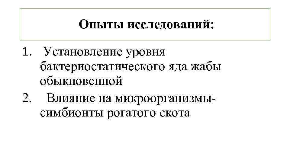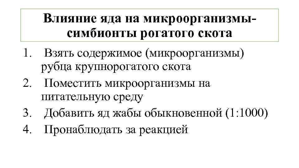Поместить микроорганизмы на питательную среду 3. Добавить яд жабы обыкновенной (1: 1000) 4. Пронаблюдать за реакцией