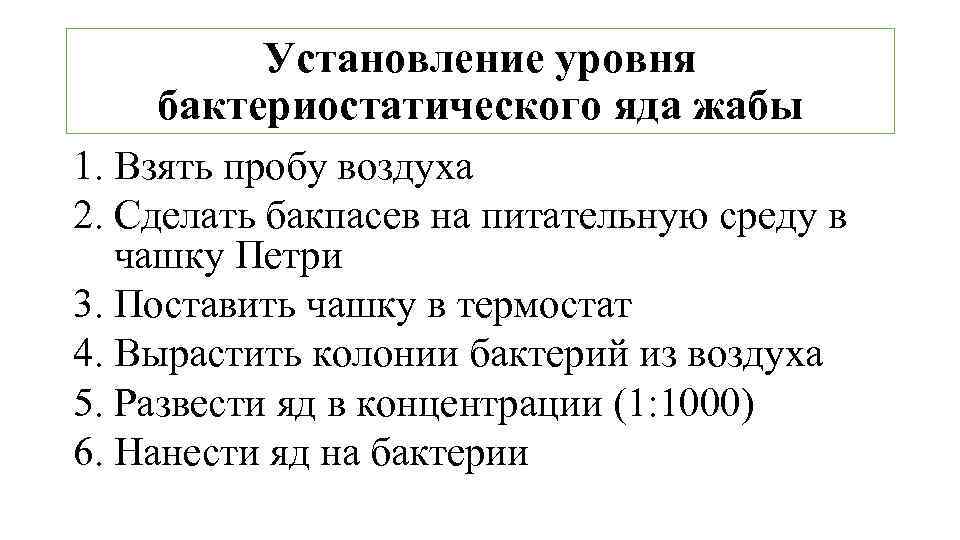 Взять пробу воздуха 2. Сделать бакпасев на питательную среду в чашку Петри 3. Поставить чашку в термостат 4. Вырастить колонии бактерий из воздуха 5. Развести яд в концентрации (1: 1000) 6. Нанести яд на бактерии