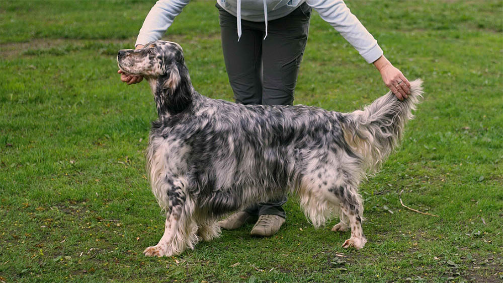 Собака — английский сеттер — имеет очень красивую длинную, немного волнистую, шелковистую шерсть. Над ушами она волнистая, но не кудрявая. На задних поверхностях конечностей красивые очесы.