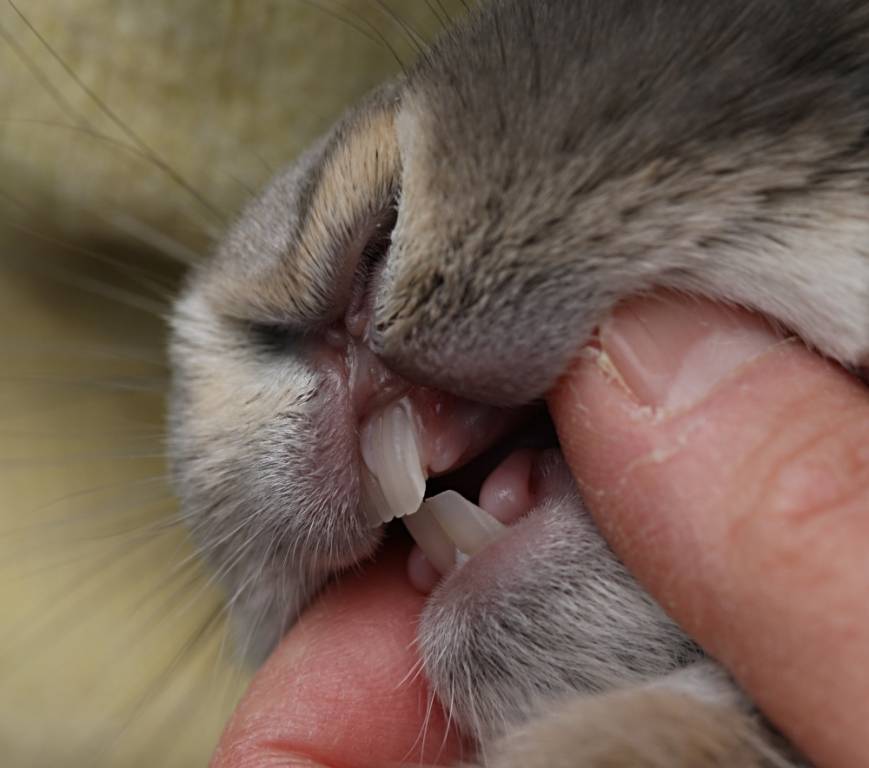 Важное отличие кроликов от грызунов заключается в том, что у грызунов на верхней челюсти расположено 2 резца, а кролики на верхней челюсти имеют 4 резца, растущих друг за другом. Всего у кроликов 28 зубов