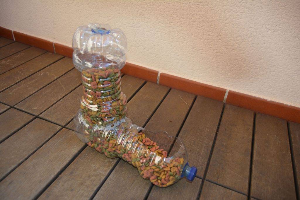 - Края полученных отверстий будут очень острыми. Чтобы уберечь животное от ранений, следует опалить их зажигалкой. Затем внутрь через горлышко нужно насыпать корм, различные лакомства и игрушки.