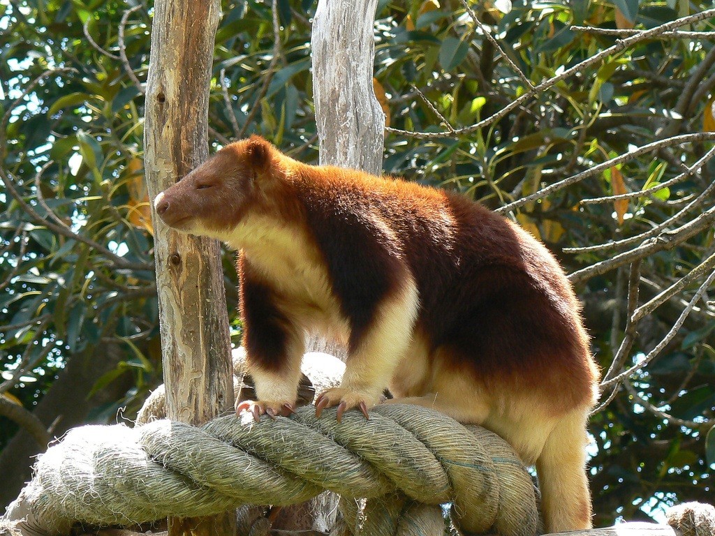 По поверхности земли древесный кенгуру не прыгает, а бегает. Таз сформирован так, что задние лапы двигаются независимо друг от друга – у наземных кенгуру подобные возможности отсутствуют. Вылезая на деревья, древесный кенгуру крепко цепляется за кору когтями передних лап, а потом по очереди подтягивает задние.