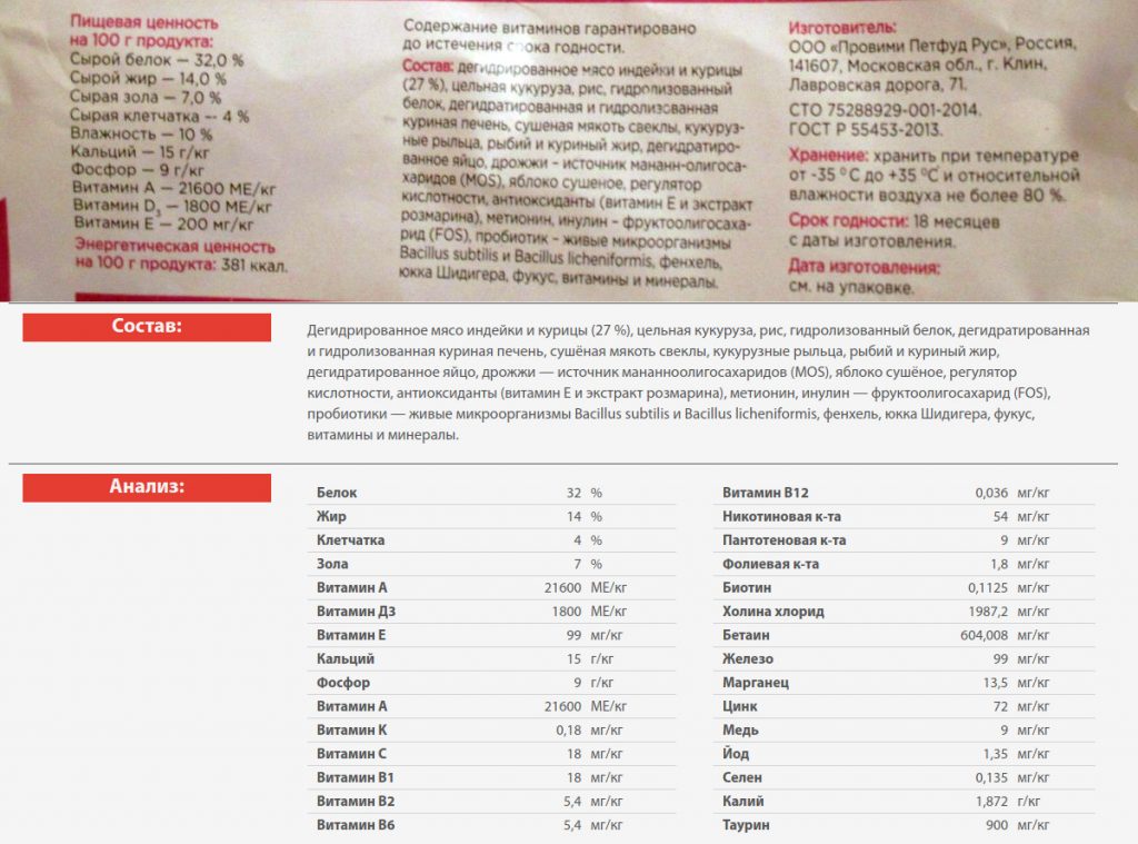 Источниками углеводов выступают цельная кукуруза и рис, которые находятся на втором и третьем месте состава соответственно. Источники клетчатки — сушёная мякоть свеклы, кукурузные рыльца, сушёное яблоко. Источники насыщенных и ненасыщенных жирных кислот — куриный и рыбий жир соответственно.