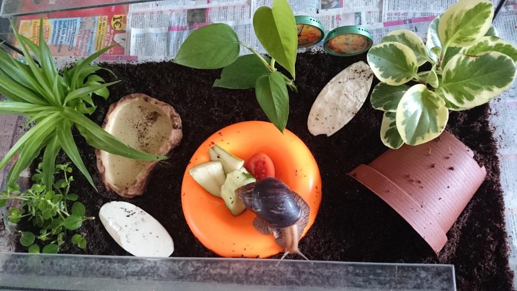 Для ахатин нужны прямоугольные террариумы с большой площадью дна. Большой приток кислорода этим улиткам не нужен. Для вентиляции используется проточная система, места входа и выхода воздуха представляют собой ряды отверстий диаметром 3–4мм.