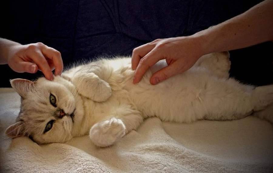 Если питомец не даёт прикоснуться к животу и реагирует на любую попытку жалобным мяуканьем или агрессией, то такое поведение указывает на патологии брюшной полости.