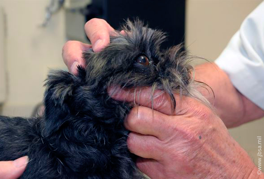 Первым делом ветеринар осматривает собаку, устанавливает очаги поражений.