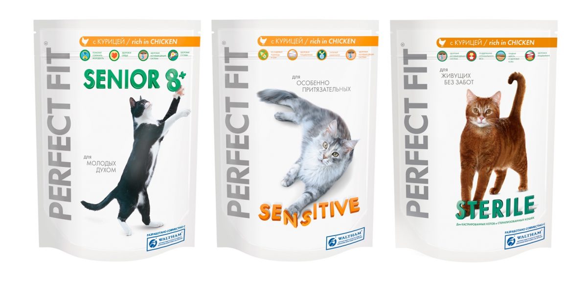 PERFECT FIT ACTIVE – корм для энергичных кошек, которые целый день находятся в движении, не важно, будь то охота или игра. PERFECT FIT SENIOR предназначен кошка «в возрасте»