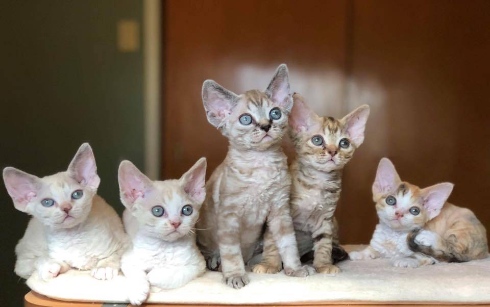 По стандарту кудрявые кошки могут иметь любую расцветку. Девон-рексы бывают: