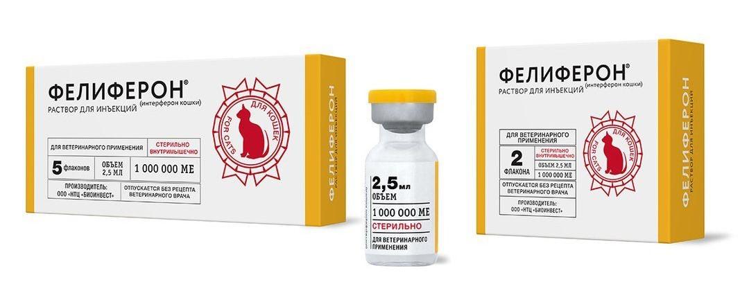 Выпускается Фелиферон только в форме раствора. Упаковывается в прозрачные стеклянные флаконы по 2,5 мл (в 1 мл препарата — 400 000 МЕ интерферона). Продаётся в ветеринарных аптеках по 1, 2 и 5 шт. Цена — от 350 р. за флакон.