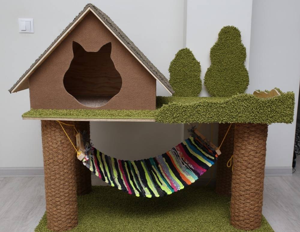 Ну и кошки любят не только играться, но и прятаться куда-нибудь в укромный уголок, чтобы понежиться в свое удовольствие. Для этого идеально подходят различные уютные домики или лежаки, позаботьтесь о том, чтобы хоть одно такое сооружение было в вашей конструкции.