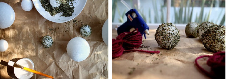 Теперь необходимо нанести кисточкой на поверхность шарика клей, а сам шарик обвалять в кошачьей мяте.