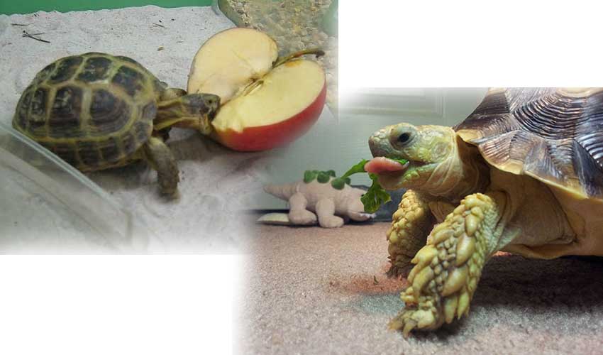Черепахам необходимо обеспечить сбалансированное питание. Сухопутных черепах можно кормить листьями капусты, одуванчика, мякотью яблок, огурцов, помидоров. Для удовлетворения потребности в белковой пище им можно давать варенные куриные яйца и витаминные добавки.