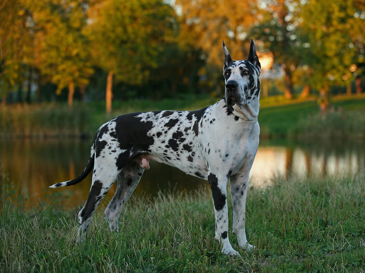 Размер питомца весьма внушительный: рост около 80 см., вес около 90 кг. Представителей с белой окраской и черными пятнами называют также долматинскими догами.