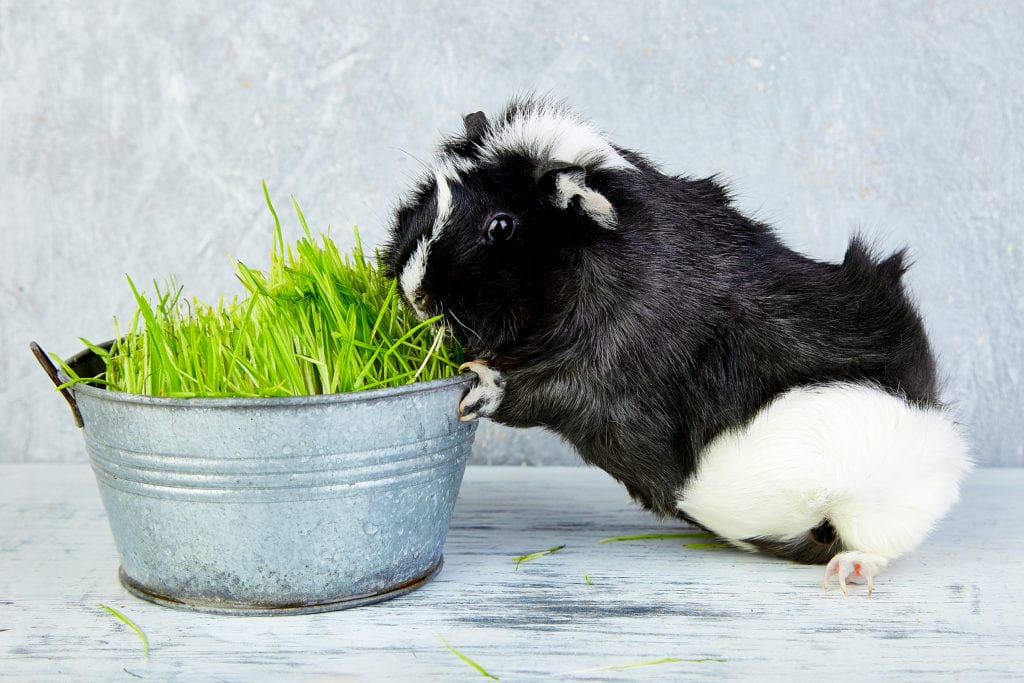 Рацион домашнего питомца должен быть таким же, как и у его диких сородичей. Свинок кормят свежей травой, садовой зеленью (укроп, салат, шпинат). В летнее время зверька также подкармливают дикорастущими растениями: клевером, люцерной, листьями подорожника и одуванчика. Зимой можно для грызуна проращивать ячмень, овес, пшеницу.
