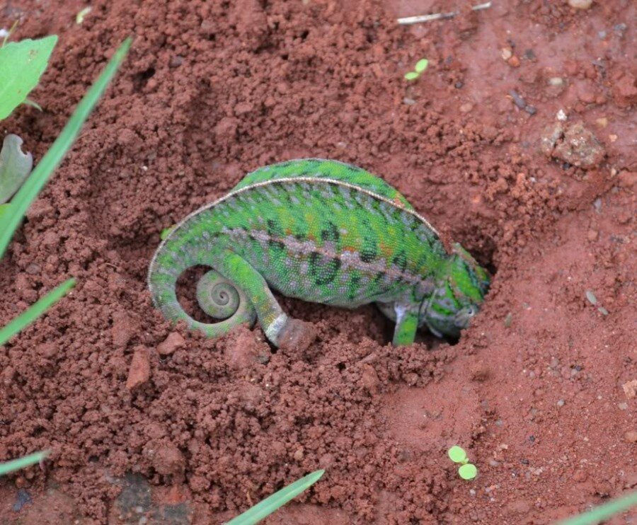 Появляющиеся на свет хамелеоны оперативно избавляются от яичной скорлупы и быстро скрываются в условиях густой растительности, которая призвана скрыть их от естественных врагов, выслеживающих беззащитную добычу. Как правило, молодые особи начинают самостоятельно питаться сразу же после рождения или на второй день после этого. Таким образом, самка в условиях дикой природы не заботится о выживании потомства, и маленьким хамелеонам приходится самостоятельно выживать.