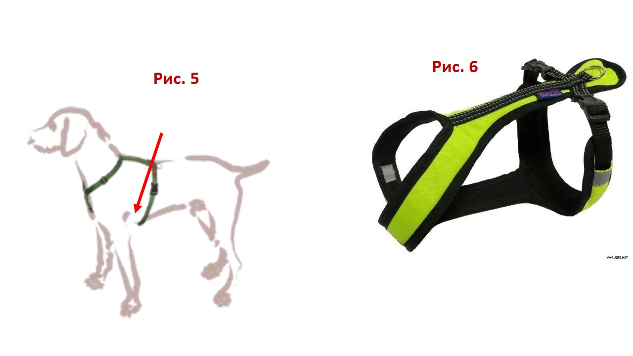 Лямки шлейки, находящиеся за передними конечностями (которые опоясывают тело собаки), — должны на некоторое расстояние отходить от плеча, чтобы не натирать подмышки и не мешать движению конечностей (рис. 5).Они не должны быть слишком узкими, чтобы не врезаться в тело собаки (рис. 6).
