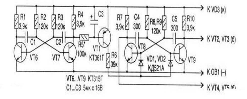 - транзисторы VT1-VT Входят в состав частотного контура вместе с конденсаторами и резисторами. Можно поставить элементы марки КТ361Б, p-n-p-транзисторы 1Т3307А, КТ3107;
