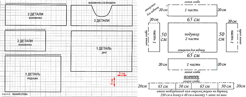 Очень важно правильно рассчитать количество материала для подушки и бортов с учетом подгиба на швы. Итак, нам будут нужны: