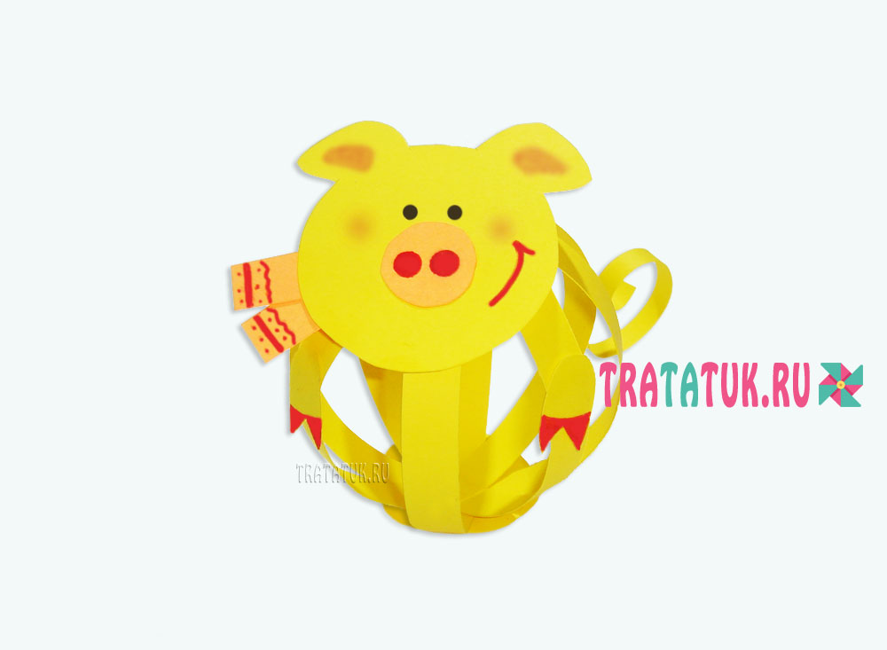 Поделка хрюши мало чем отличается от других персонажей, сделанных из тонких полосок картона, главное – это соответствующий облик с пятачком и характерными ушками.