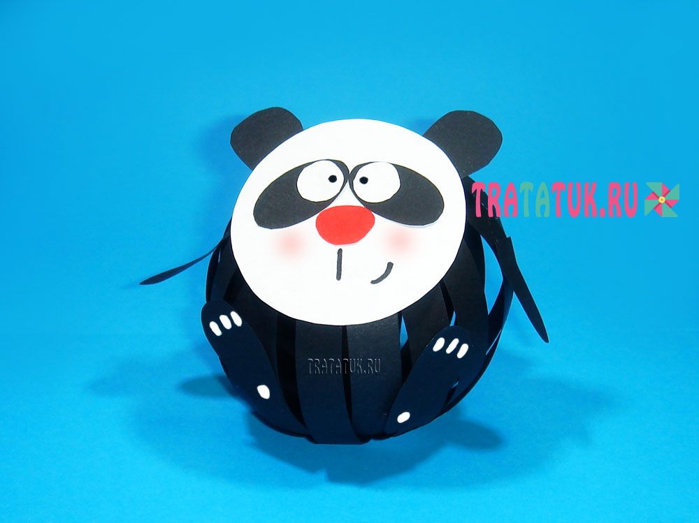 Панда из бумаги состоит из головы в виде круга и объемного туловища из тонких бумажных полосок. Персонажей, которые созданы посредством этой техники, на сайте очень много, с некоторыми из них можно ознакомиться в обзоре – поделки из полосок бумаги.