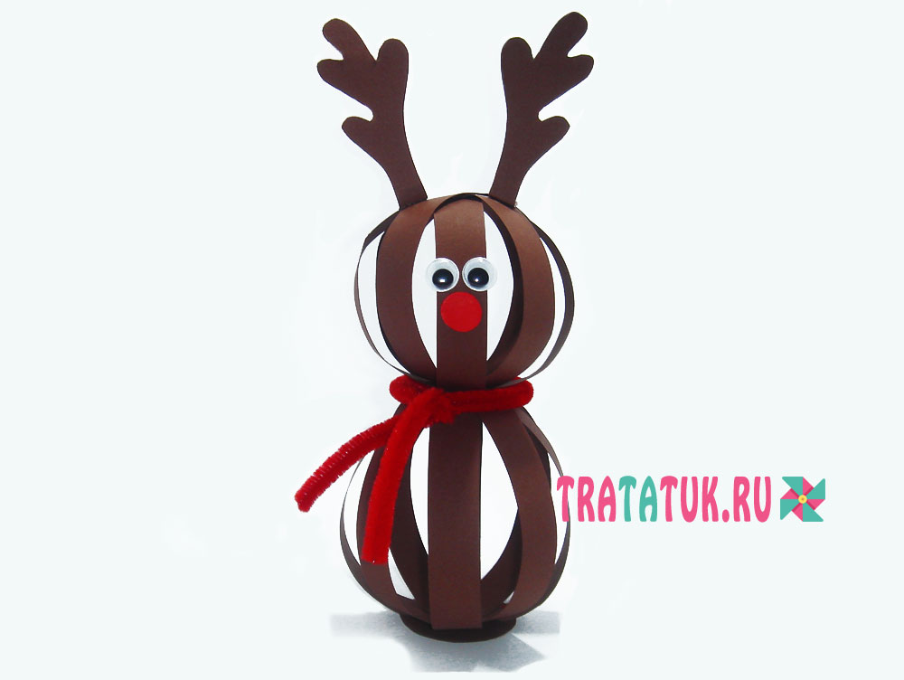Как правило, это новогодняя поделка, легкая, интересная и полезная для детей. Причем данного оленя украшают не только рога, но и шарфик из синельной проволоки.