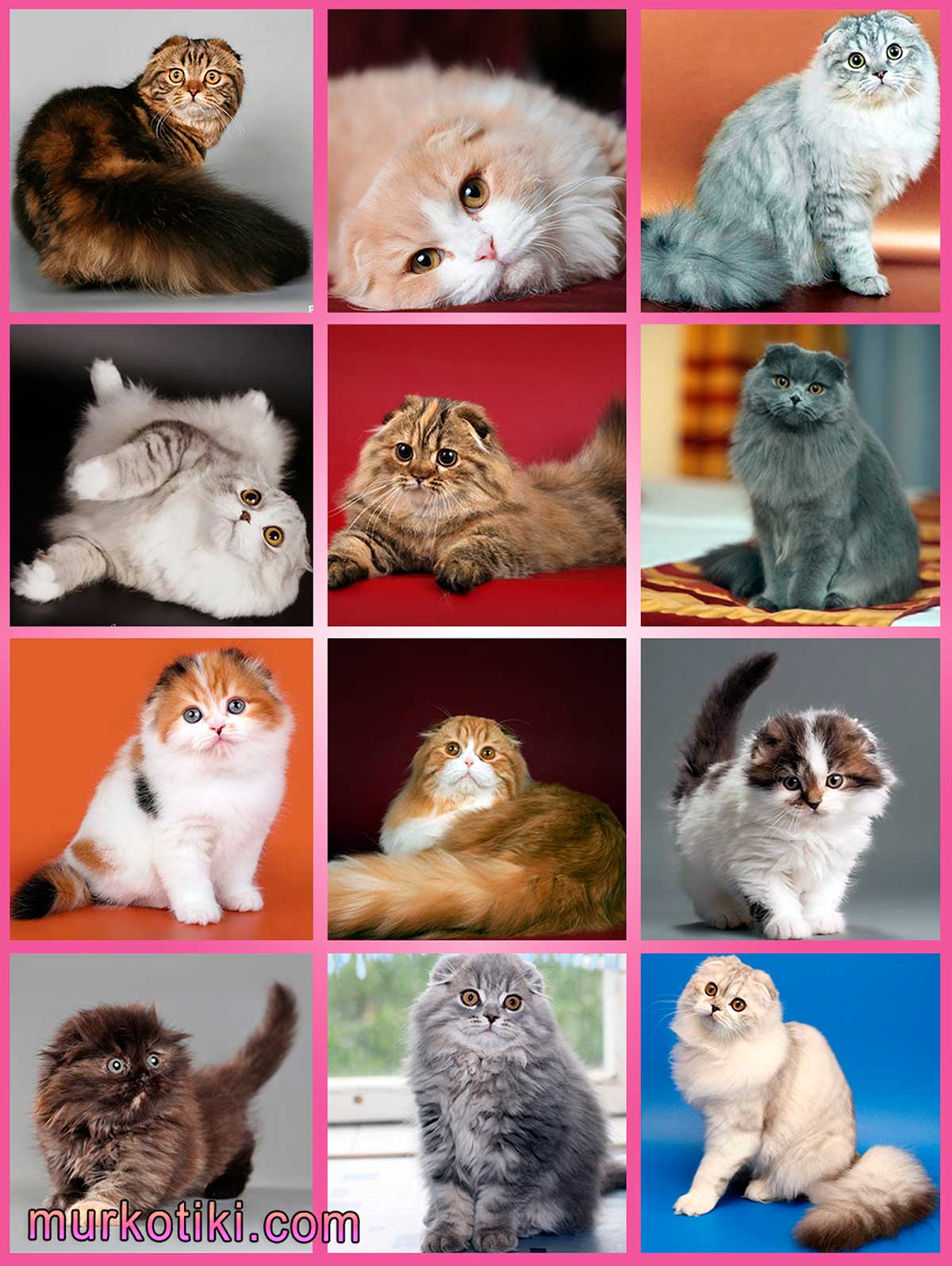 Первоначально шотландцев были голубого цвета. Сейчас их палитра очень богата , от дымчатого до шоколадного. Они могут быть короткошерстными или же длинношерстными. Эти зверята всегда радуют своих владельцев густотой и мягкостью своего меха.