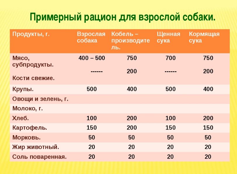 Таким образом, идеальным рационом для собаки будет сочетание трех частей говядины с субпродуктами, трех частей каши на основе овсяной или пшеничной крупы, по одной части хлеба и овощей.