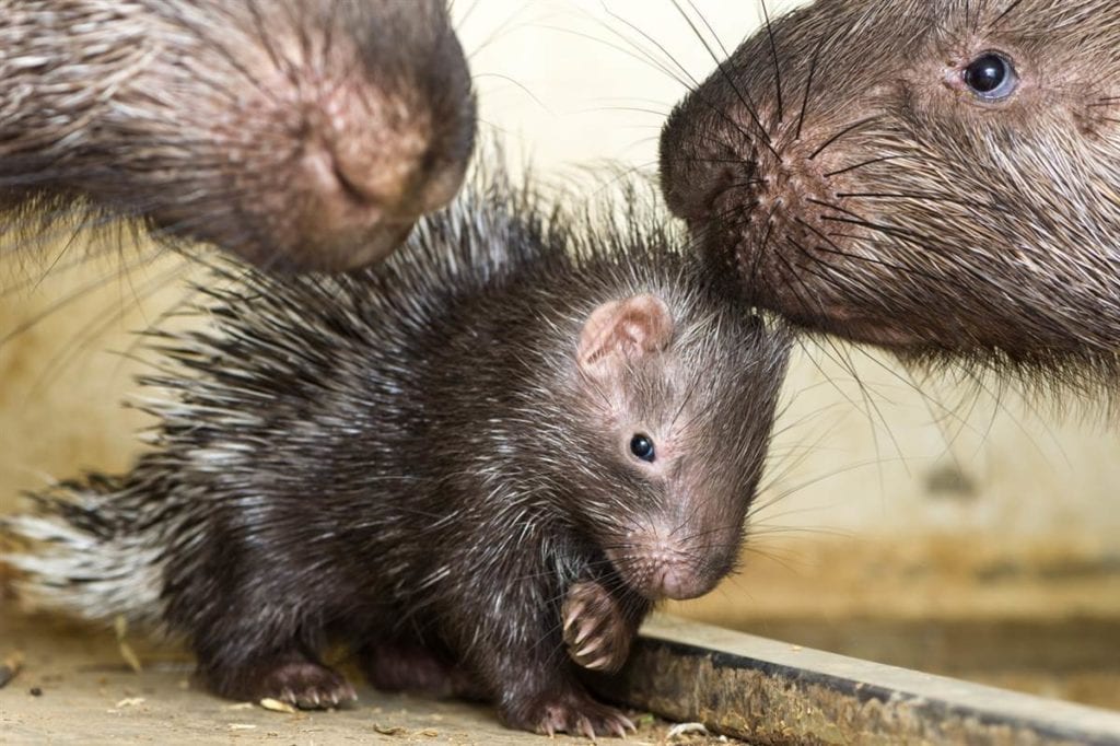 Самки кормят детенышей молоко всего 2-3 недели, после чего выводят потомков из логова, чтобы они приобщились к растительной пище. Практически через месяц юные дикобразы выглядят уменьшенными копиями своих родителей, и повсюду следуют за матерью и отцом.