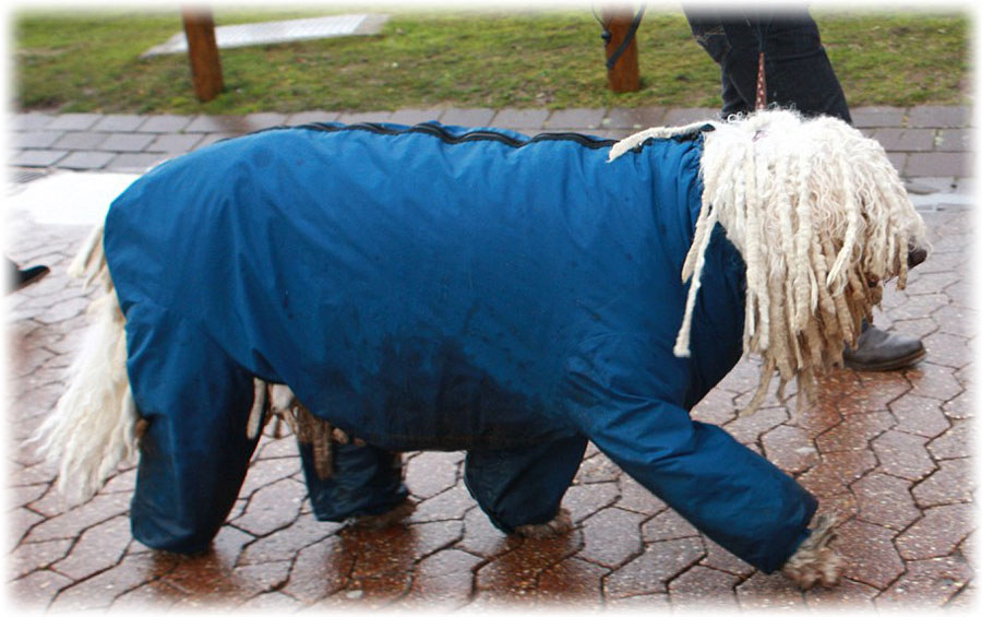 Комбинезон пригодится для комондоров содержащихся в квартире. Он поможет сохранить чистоту и сухость шерсти в дождь.