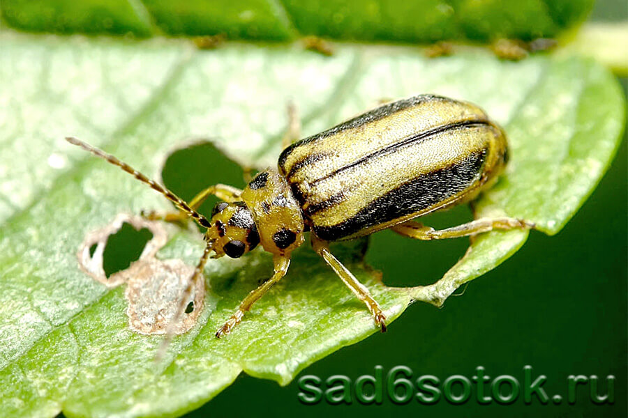 - Окраска жука – брюшко оранжево-медное, спинка золотисто-зелёная, блестящая. Надкрылья украшены белесыми полосками.