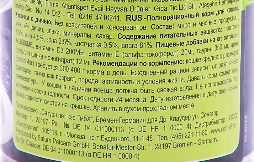Состав влажного корма проанализируем на примере консервы Dr. Clauder’s с дичью. На жестяной банке указаны следующие компоненты: