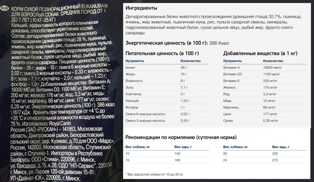Рассмотрим состав корма Eukanuba взяв за пример варианта Adult Medium 1-7 years (для взрослых собак средних пород). Посмотреть состав можно на изображении ниже (кликните по нему чтобы увеличить для удобности чтения):