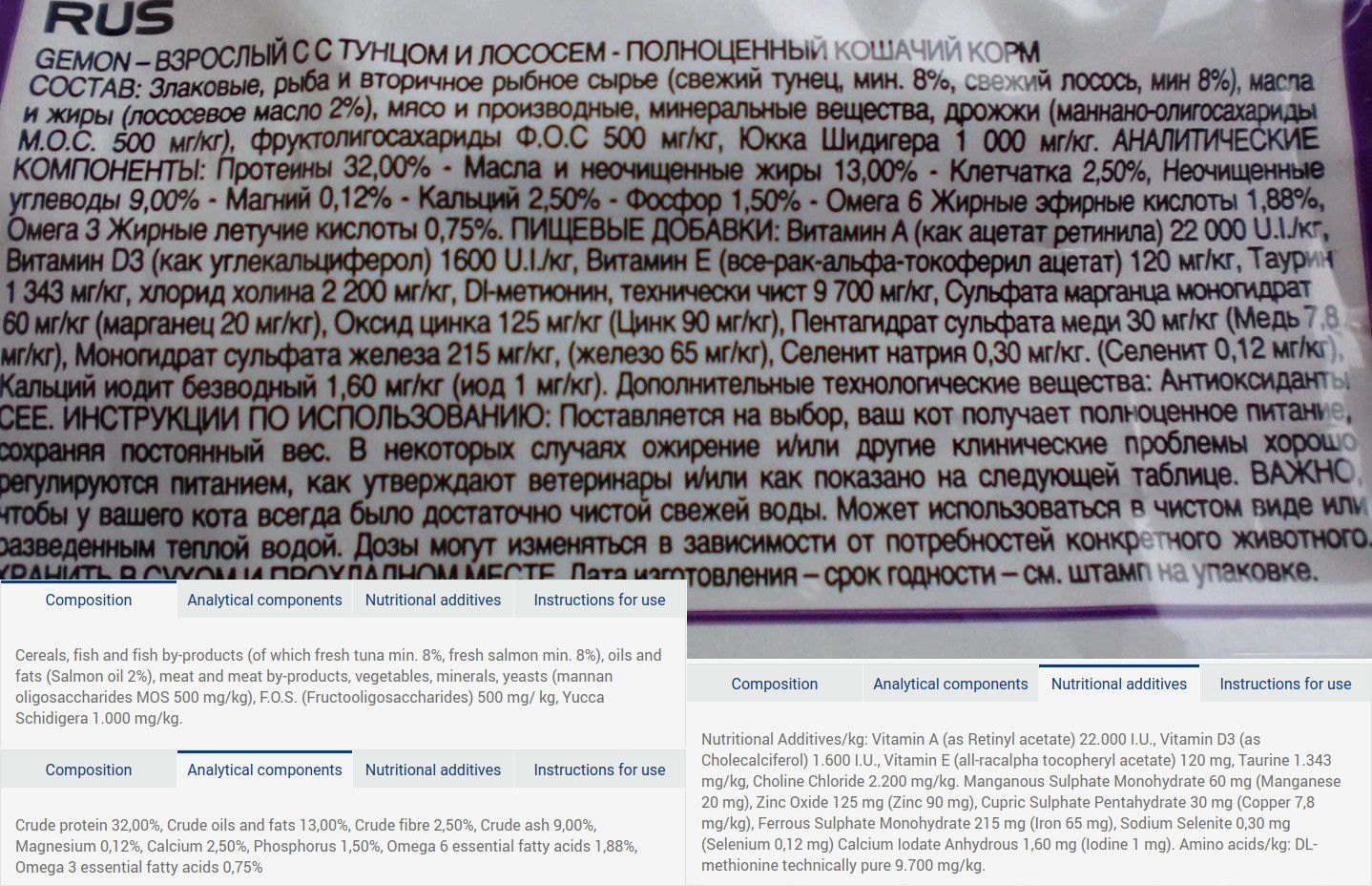 Ознакомимся с составом корма Gemon на примере варианта «Adult Complete with Tuna and Salmon» (для взрослых кошек с тунцом и лососем). Посмотреть его можно на изображении ниже (для удобности чтения кликните по нему чтобы увеличить):