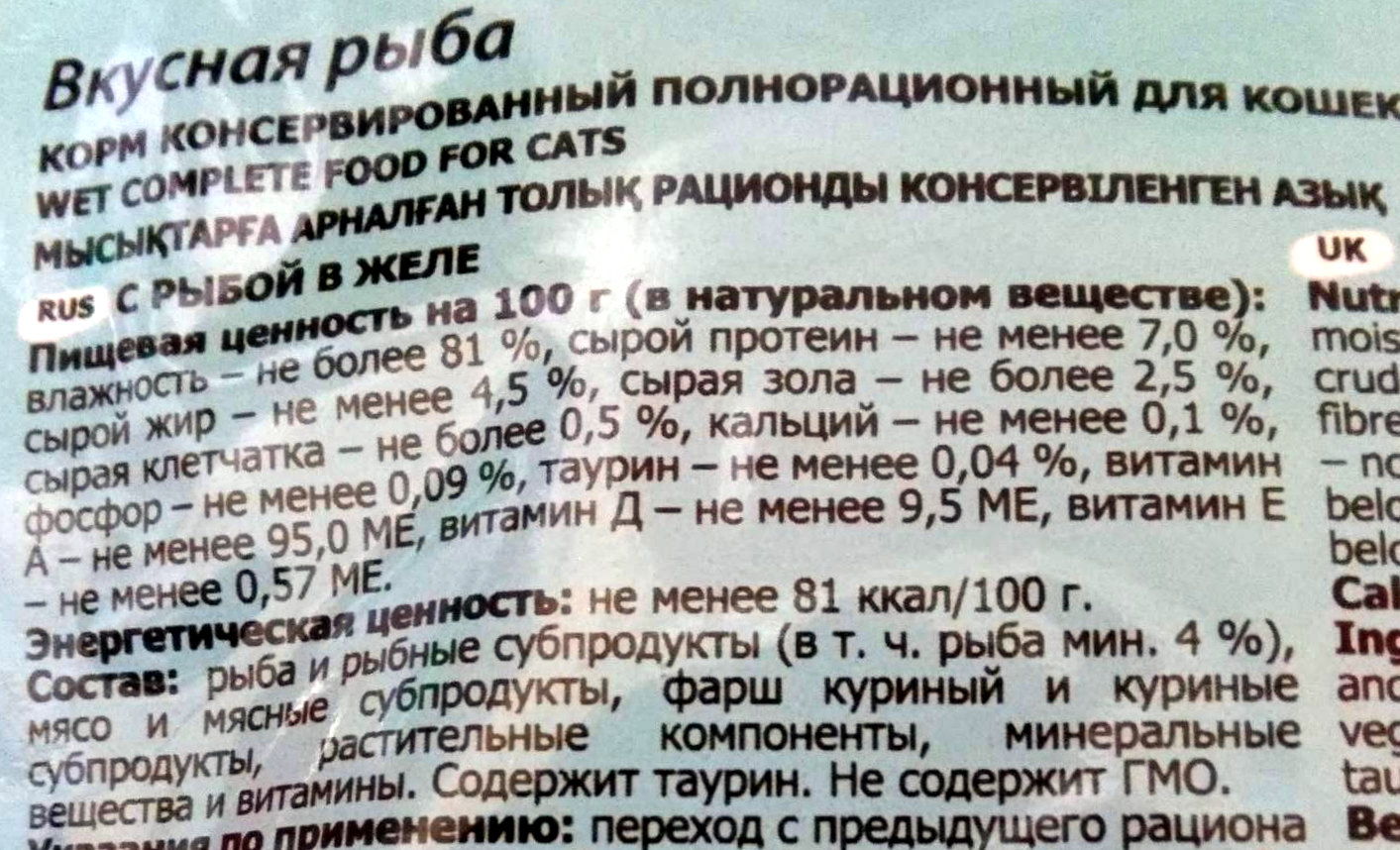 В основе паучей лежат: рыба и рыбные субпродукты, мясо и мясные субпродукты, фарш куриный и куриные субпродукты. С одной стороны выглядит хорошо, так как имеем много мясных ингредиентов. С другой стороны — в ингредиенте «рыба и рыбные субпродукты» указано «мин 4% рыбы», а остальное неизвестные «рыбные субпродукты». Вероятно такая же ситуация и с остальными мясными ингредиентами.