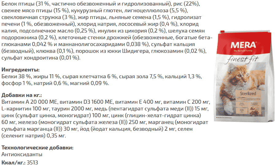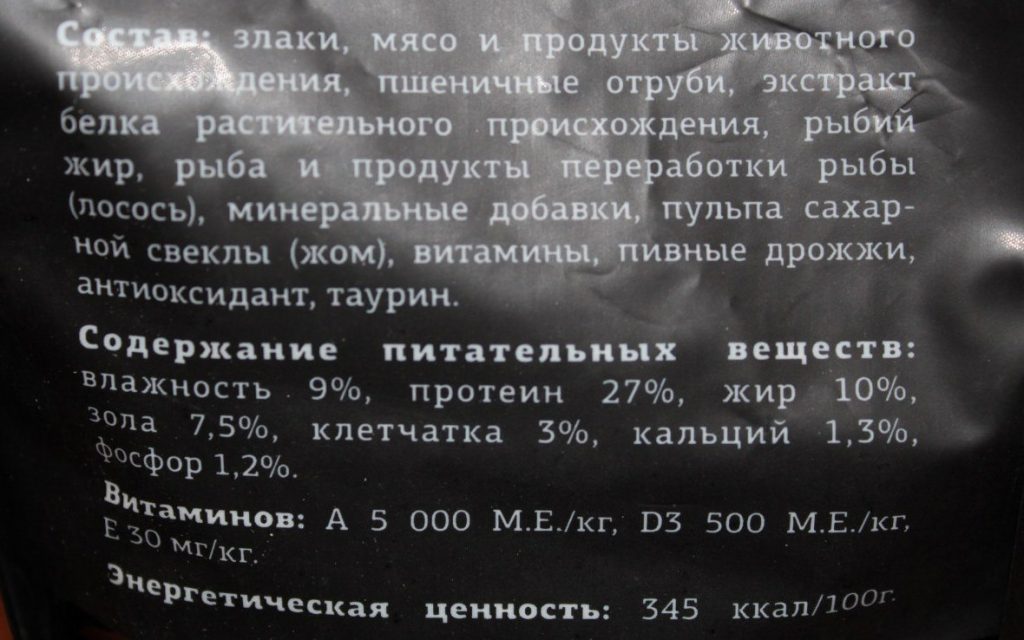 Первый ингредиент — злаки, источник углеводов (самый нежелательный в кормах для кошек). Не уточнено какие именно злаки используются. Далее идет «мясо и продукты животного происхождения», источник животного белка. Не уточнено ни общий процент ингредиента, ни в нем сколько мяса и сколько продуктов животного происхождения (и что именно это за продукты).