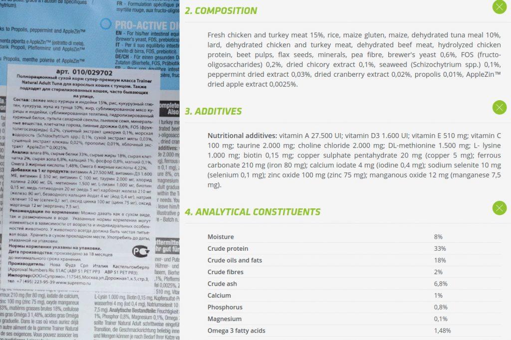 Ознакомимся с составом корма Trainer на примере варианта Natural Adult Tuna (для взрослых кошек с тунцом). Посмотреть его можно на фото ниже (рекомендуем кликнуть по изображении для его увеличения, будет удобнее читать):