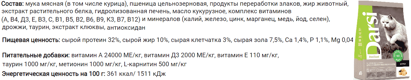 Пример состава корма Darsi для стерилизованных кошек с курицей