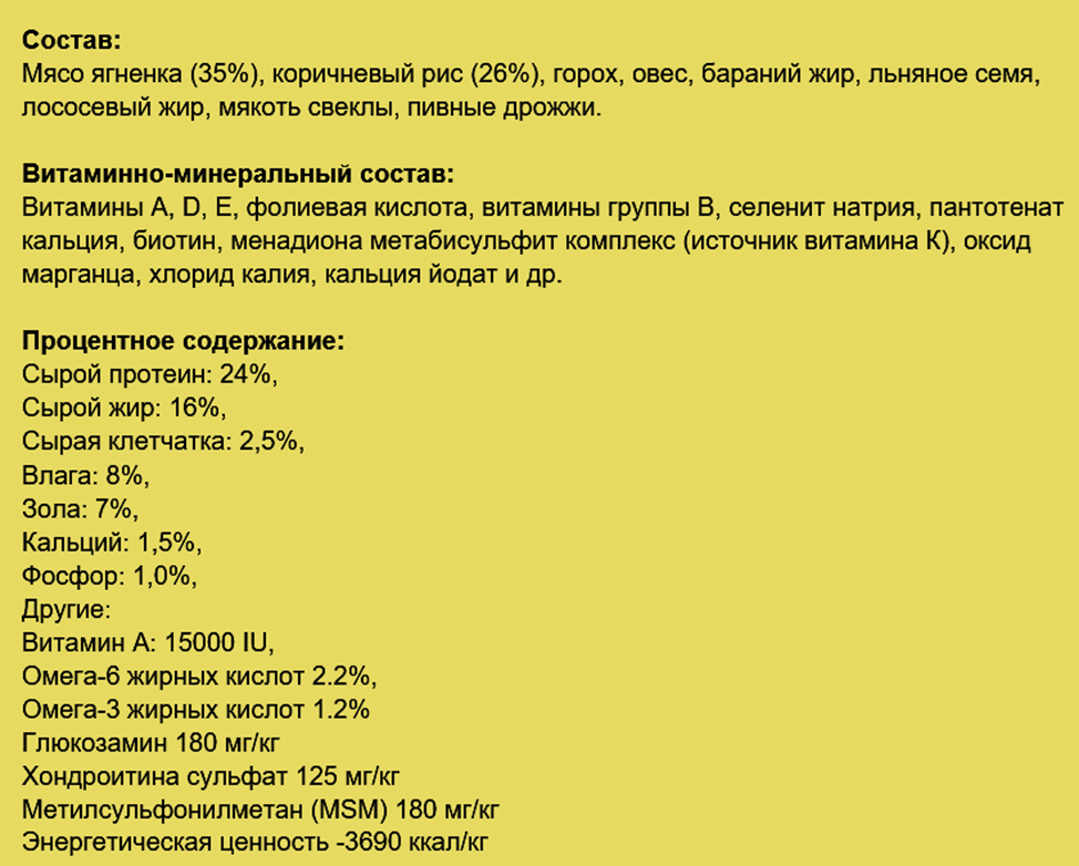 В его основе лежит гипоаллергенное мясо ягненка и длиннозернистый рис, не содержащий глютен. А пищевые волокна и полезная кишечная микрофлора стабилизируют моторику желудочно-кишечного тракта.