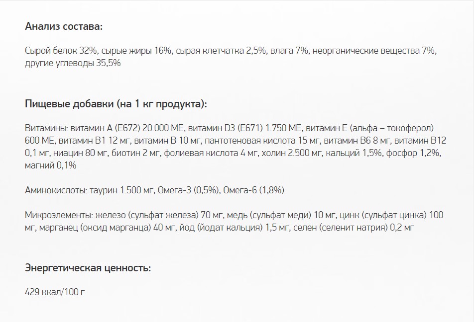 - для взрослых кошек – 429 ккал/100 г продукта;