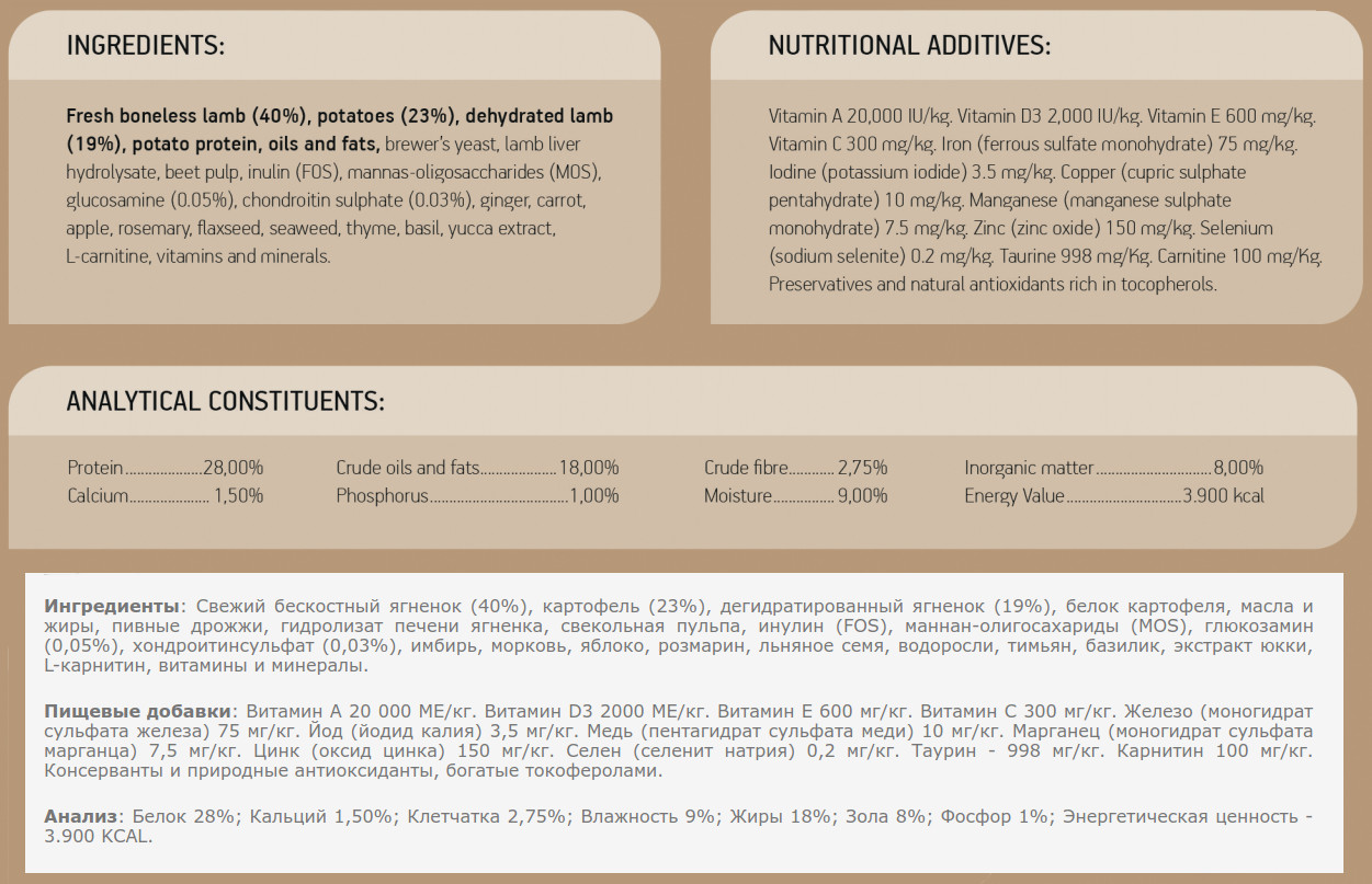 Первый ингредиент — свежий бескостный ягненок (40%), является хорошим источником протеинов. Даже если учесть что после готовки его стонет в 3-4 раза меньше, далее по составу еще есть дегидратированный ягненок (19%). Правда не понятно включает ли этот ингредиент субпродукты ягненка или состоит только из мяса, вероятнее первое.