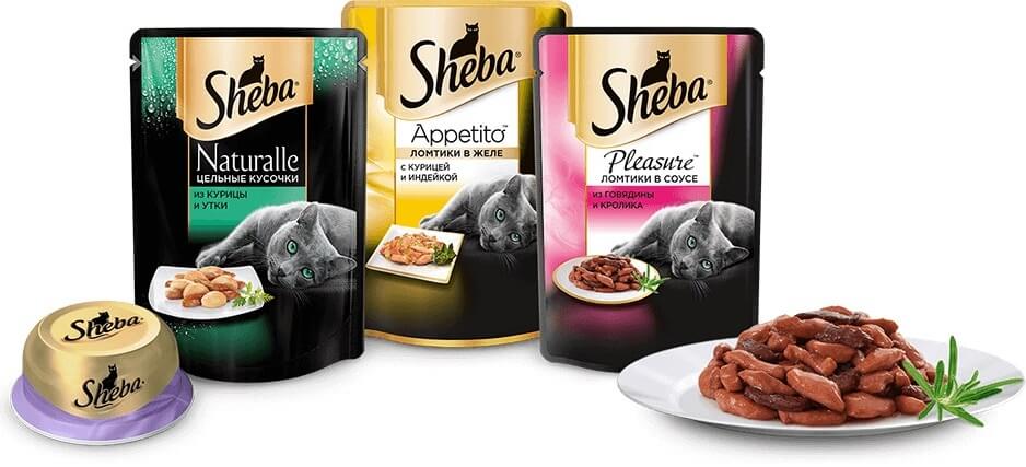 Waltham специально для Sheba разработал несколько коллекций влажных кормов. Они отличаются по комбинации используемых мясных составляющих и их оформлению. Помимо использования названия Sheba для выпуска полнорационного корма для взрослых кошек, существует еще четыре варианта консервированных кормов.