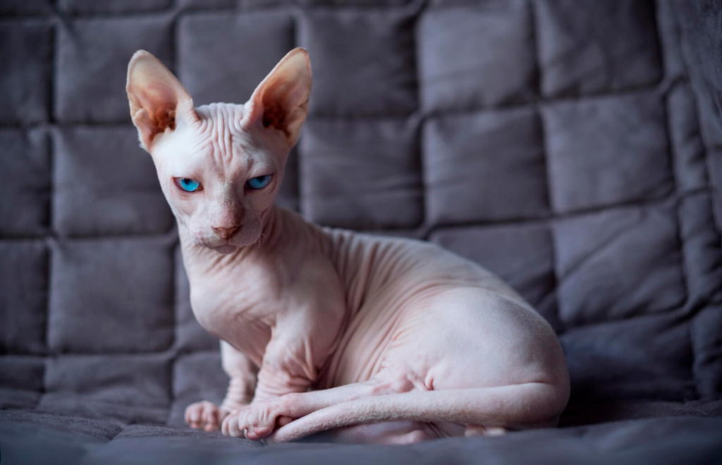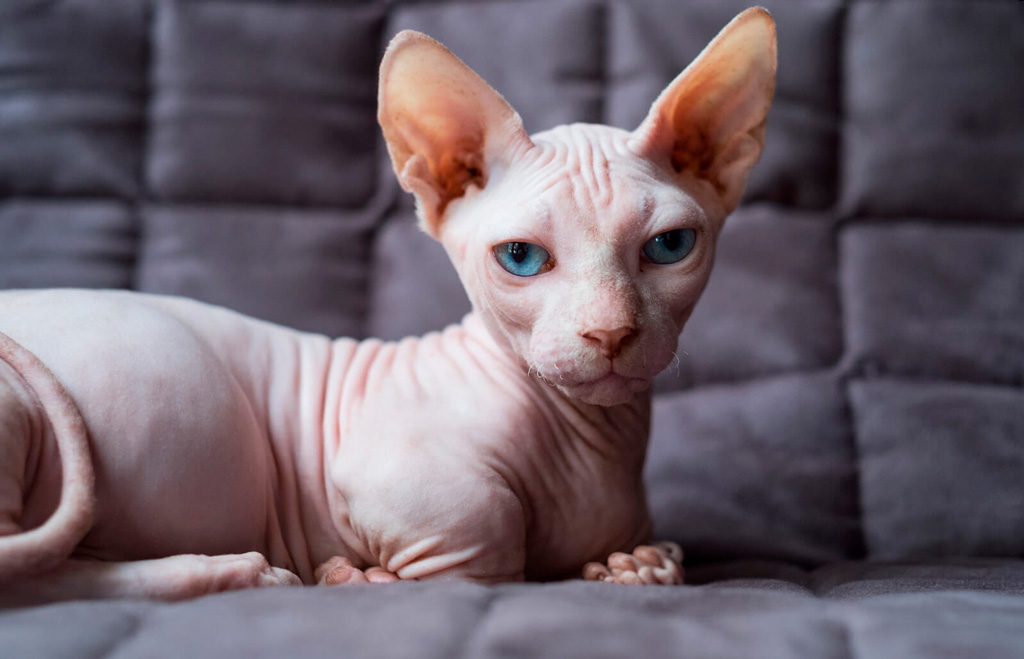| Кожные покровы | Видимое отсутствие шерсти. Допускается небольшой вельветовый пушок по корпусу, голова и морда иногда имеют иметь более интенсивное опушение. Кошка горячая и «бархатная» на ощупь. На голове и по телу – кожные складки |