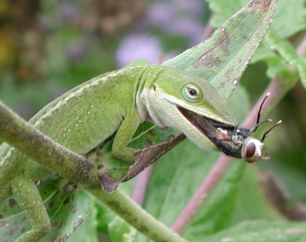 Анолис питается членистоногими: сверчками, кузнечиками, мухами, личинками насекомых, а также бабочками и пауками.