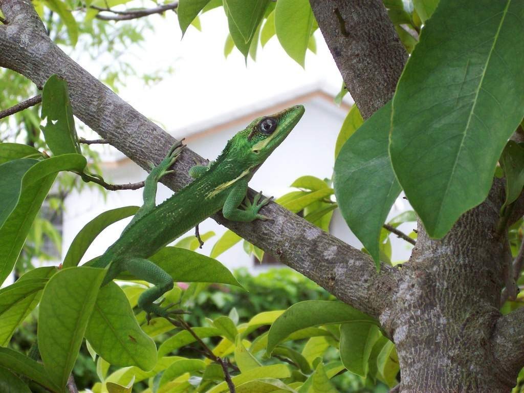 Anolis alliaceus, зацепившийся за ветку дерева и наблюдающий за поверхностью землю в поисках еды, партнёра для спаривания и конкурентов. Экотип северного Карибского моря. Национальный парк Кабритса, Доминика