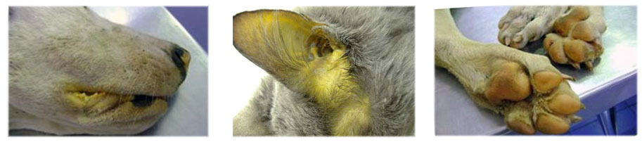 Главный признак этой формы лептоспироза — пожелтение слизистых рта, глаз, половых органов, внутренних поверхностей ушей, кожи.Собака отказывается от корма, часто лежит и сильно худеет. Появляется диарея, рвота, обезвоживание. Также отмечается почечная и печеночная недостаточность, расстройство пищеварительного тракта. Боль при пальпации области почек и печени.Смерть происходит от токсического шока при сильном воздействии ядов бактерий и от обезвоживания.Беременные собаки не донашивают щенков, либо они рождаются мертвыми. Часто возникают послеродовые осложнения. Течка может задерживаться. У кобелей отмечается воспаление уретры, препуциального мешка. Больные животные могут мочиться дома.