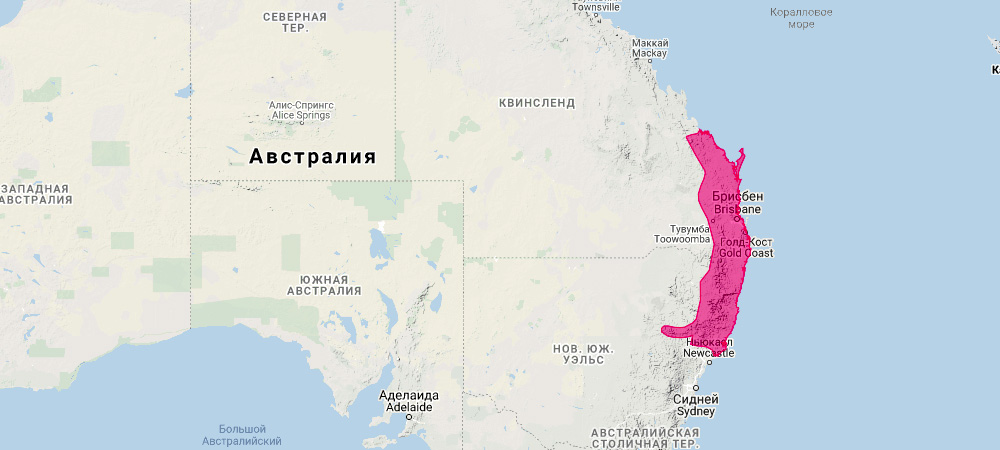 Юго-восточный Квинсленд, восточный Новый Южный Уэльс и на востоке штата Виктория, Австралия.
