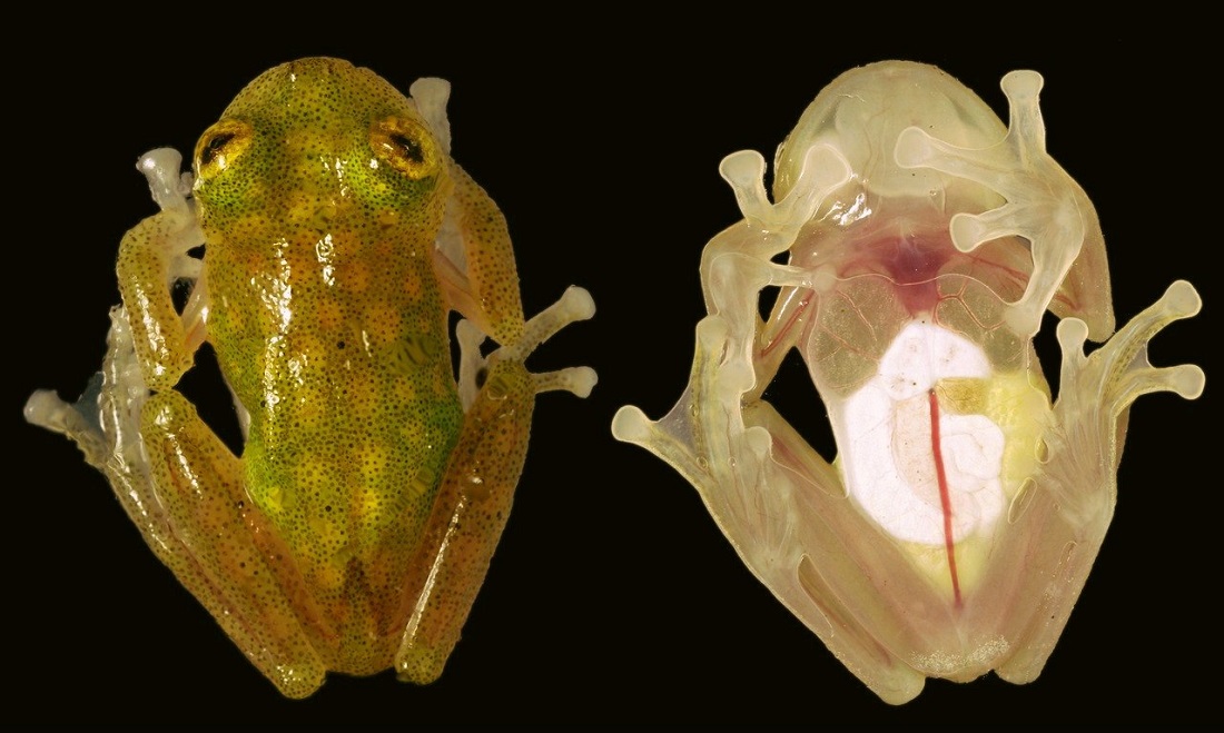 С первого взгляда кажется, что эти лягушки совершенно обыкновенные. Но если посмотреть на их животы, то можно понять, почему они называются стеклянными. Сквозь животы лягушек видно все внутренние органы. Кожа на животе у них прозрачная.