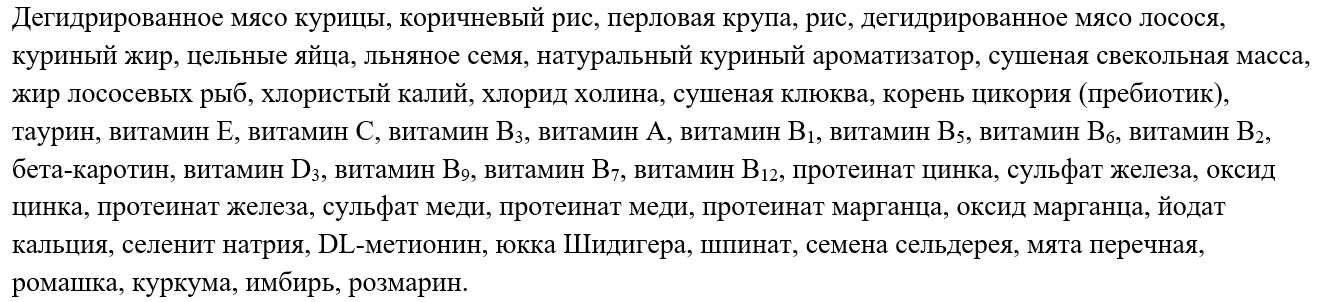 Ламинария, экстракты водорослей и мидий, куркума, киноа, концентрат сушеных сывороточных протеинов, яйца, морская соль, коричневый рис.