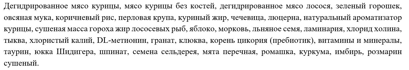 Состав тоже типичен для супер-премиум класса: в принципе, сбалансированный, со всеми необходимыми витаминами и минералами, но уже есть серьёзные недочёты вроде присутствия в составе кукурузы и кукурузной муки (надо ли повторять, что это вредный и аллергенный ингредиент?).