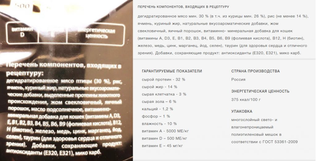 используются синтетические антиоксиданты*; - объем витаминов в гарантируемых показателей довольно низок.